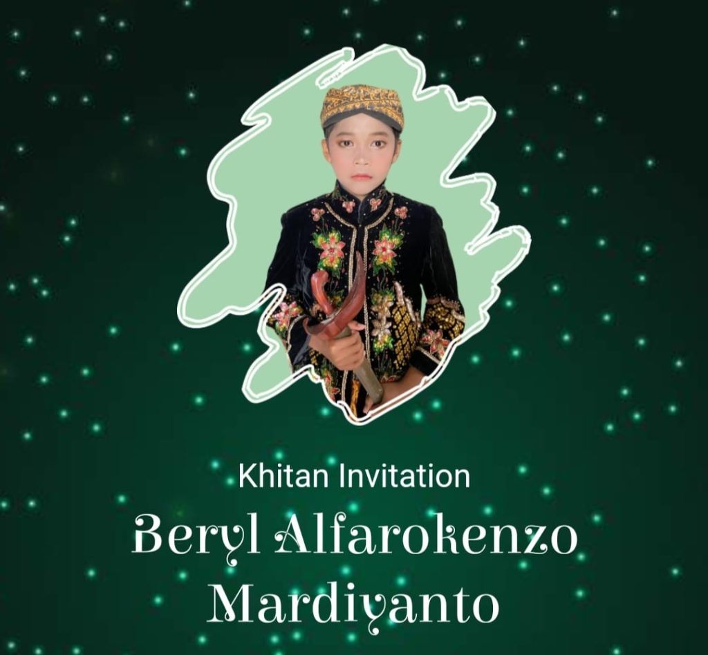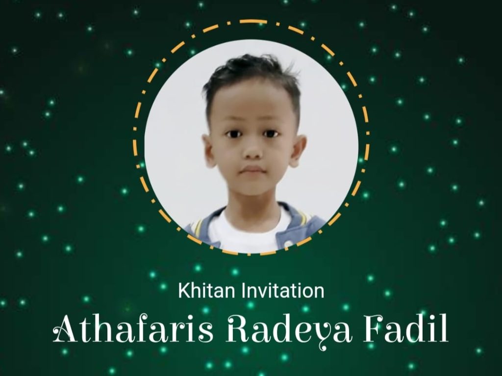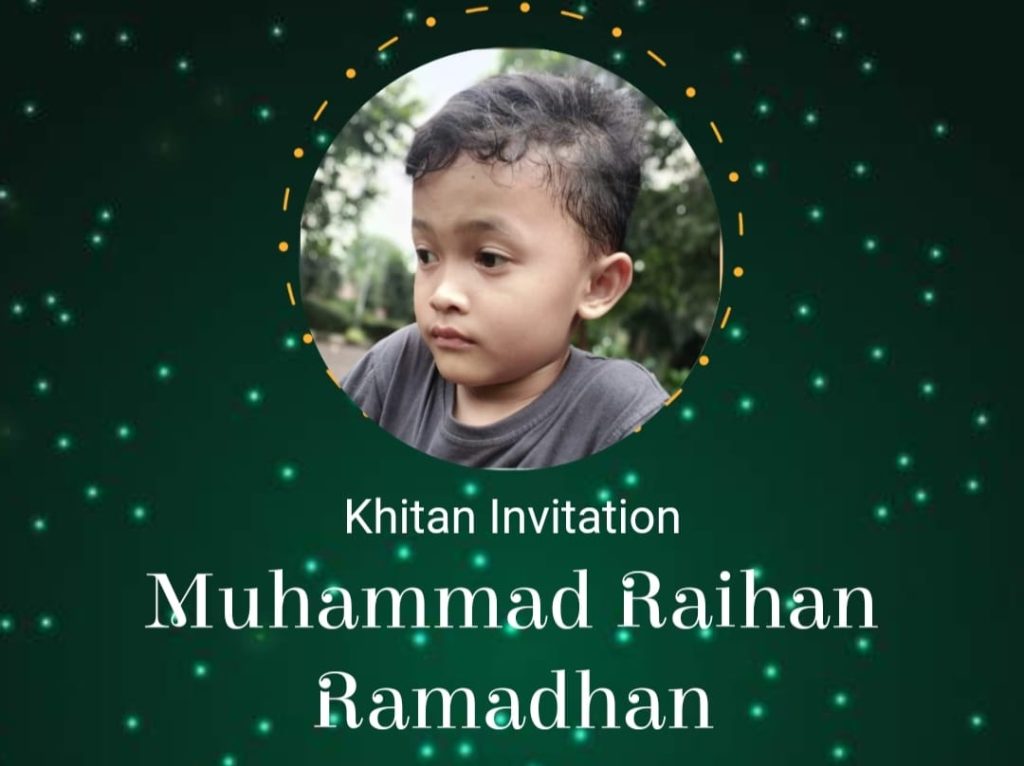 Yang Dikhitan Muhamad Reyza Alfarizky 15 | 09 | 2024 00Hari 00Jam 00Menit 00Detik “Berkhitanlah sesungguhnya khitan itu dapat menjadikan wajah lebih cerah dan menambah kebahagiaan dalam keluarga” (HR. Ummu Athiyah) Assalamu’alaikum Wr. Wb. Dengan memohon rahmat dan ridho Allah SWT, kami bermaksud mengundang Bapak/Ibu/Saudara/i untuk menghadiri acara Tasyakuran Khitan putra kami Muhamad Reyza Alfarizky […]